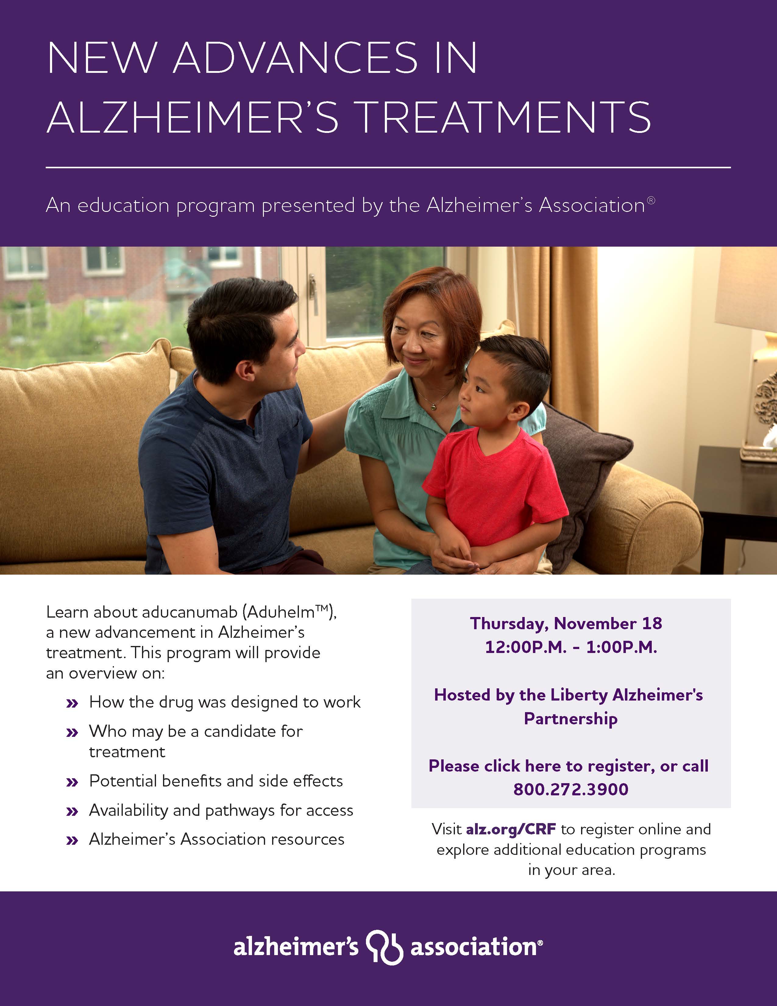 The Alzheimer's association is offering a program on new advances in Alzheimer's treatment. For more information click the following link: